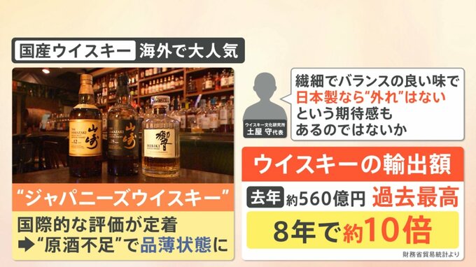 ウイスキーの輸出額は2022年、約560億円で過去最高。8年で約10倍になったそうです。