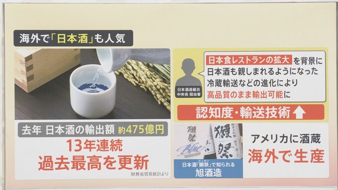 酒造組合の方に聞くと「日本食レストランの拡大を背景に、日本酒も親しまれるようになった。冷蔵輸送などの進化により、高品質のまま輸出可能になった」。認知度も輸送技術も上がって、たくさん飲まれるようになったということなんです。