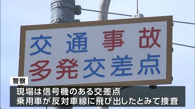 現場は信号機のある交差点で、警察は乗用車が何らかの理由で反対車線に飛び出し、大型トラックに衝突したとみて事故の原因を調べています。