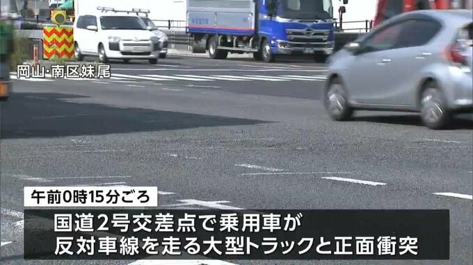 11日午前0時15分頃、岡山市南区の国道2号交差点で乗用車が反対車線を走っていた大型トラックと正面衝突しました。