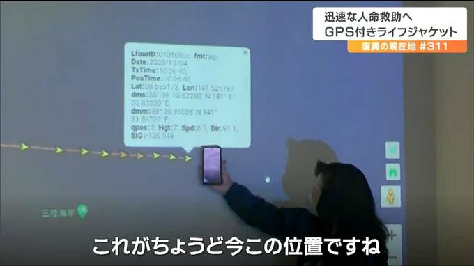 GPSの情報を頼りに位置の解析を始めていました。日本初というこのGPS機能付きライフジャケット。12年前の震災の教訓をもとに開発が始まりました。