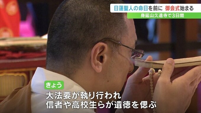 11日は大法要が執り行われ、雅楽の演奏が本堂に響く中、信者や地元・身延山高校生の生徒らが手を合わせて、日蓮聖人の遺徳を偲びました。