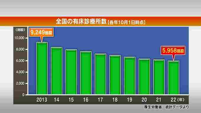 しかし今、有床診療所が急速に減少しています。10年前の2013年、全国に9249施設あった有床診療所は、去年5958施設にまで減りました。3割以上がなくなったことになります。