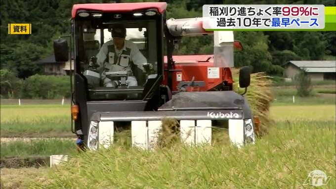 青森県内の稲刈りが早いペースで進んでいます。県全体の進み具合、進ちょく率は99%になり、過去10年で最も早くなっています。青森県によりますと10日時点の稲刈りの進ちょく率は99%で、いつもの年を19ポイント上回…