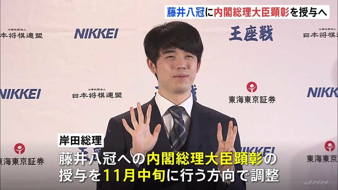 岸田総理は、きのう将棋界で史上初となる八大タイトル独占を達成した藤井聡太八冠について、内閣総理大臣顕彰の授与を11月中旬に行う方向で調整していると明らかにしました。今回の快挙について「将棋の普及発展を…