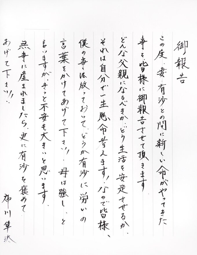 布川さんは、SNSに添付された直筆のコメントで「この度、妻・有沙との間に新しい命がやってきた事を皆様に御報告させて頂きます。」と報告。さらに「どんな父親になるべきか、どう生活を安定させるか、それは自分で一生懸命考えます!」と今の心境を吐露。続けて「なので皆様、僕の事は放っておいて、どうか有沙に労いの言葉をかけてあげて下さい!母は強しと言いますが、きっと不安も大きいと思います。無事に産まれましたら、更に有沙を褒めてあげて下さい!!!」と妻を思いやりました。