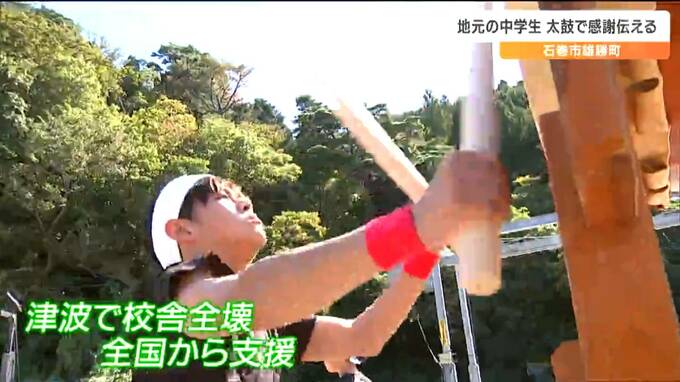 浜の人たちに感謝の思いを伝えました。宮城県石巻市雄勝町の漁港で12日、地元の中学校の全校生徒10人が、伝統の太鼓を演奏しました。石巻市の桑浜漁港で太鼓を演奏したのは、雄勝中学校の全校生徒10人で、地元の浜…