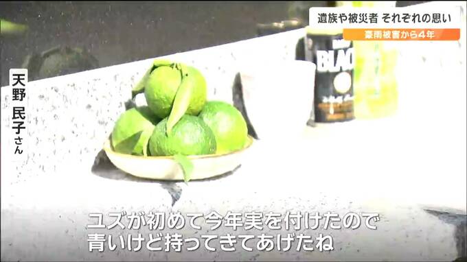 災害後、実家から天野さんが自宅に移植したユズの実を花とともに手向けました。