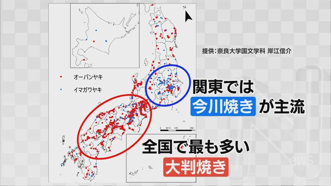岸江教授が調べたところ、いまでも全国で最も多い呼び名は『大判焼き』また、青い点で示された『今川焼き』は関東を中心に呼ばれています。