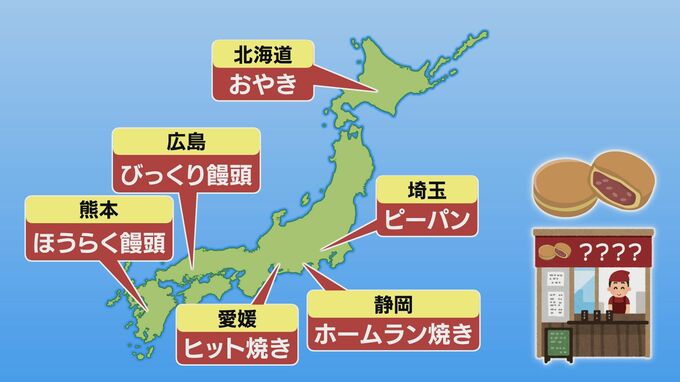 埼玉県ではピーパン、静岡県ではホームラン焼きなどと呼ばれ、北海道では「おやき」と呼ばれているそうで長野の「おやき」とは異なるそう。