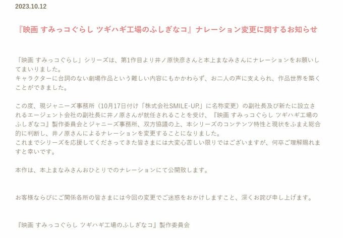 公式サイトは「『映画 すみっコぐらし ツギハギ工場のふしぎなコ』ナレーション変更に関するお知らせ」と題し、「この度、現ジャニーズ事務所(10月17日付け「株式会社SMILE-UP.」に名称変更)の副社長及び新たに設立されるエージェント会社の副社長に井ノ原さんが就任されることを受け、『映画 すみっコぐらし ツギハギ工場のふしぎなコ』製作委員会とジャニーズ事務所、双方協議の上、本シリーズのコンテンツ特性と現状をふまえ総合的に判断し、井ノ原さんによるナレーションを変更することになりました。」と、昨今の状況を鑑みたうえでの変更となることを説明しています。