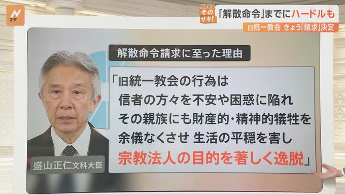 所管する盛山正仁文科大臣は、解散命令請求に至った理由について「旧統一教会の行為は、信者の方々を不安や困惑に陥れ、その親族にも財産的・精神的犠牲を余儀なくさせ、生活の平穏を害し、宗教法人の目的を著しく逸脱している」と会見で話しました。