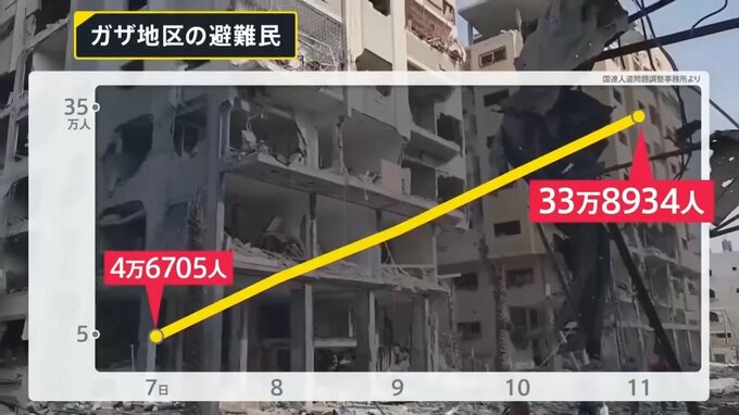 その日を境に、ガザの避難民は爆発的に増えていて、11日には人口のおよそ15%にあたる33万8934人に達しました。