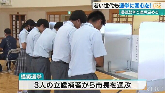 この日は伊良部島小中学校の小学6年生と中学3年生が参加し、選挙制度やその意義について学んだあと、3人の立候補者から市長を選ぶ模擬選挙を行いました。
