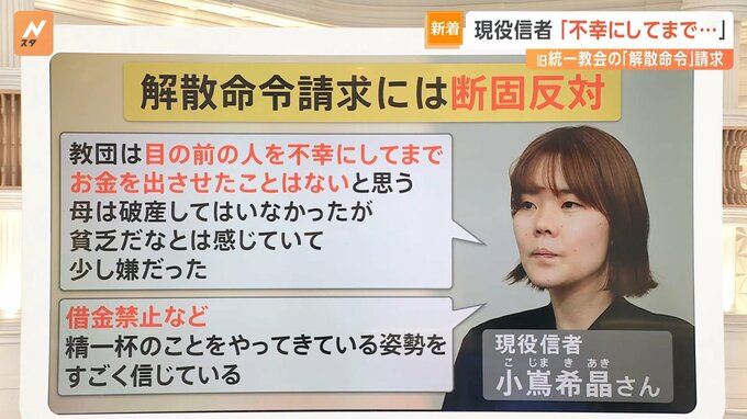 現役信者、二世信者の小嶌希晶さんにインタビューをしてきました。小島さんはこのように話しています。解散命令請求には断固反対であると示した上で、「教団は目の前の人を不幸にしてまでお金を出させたことはないと思う」自身の母親も信者でありますけれども、「破産はしていなかったが貧乏だなと感じていて少し嫌だった」と振り返っていました。「現在は借金を禁止するなど教団も精一杯のことをやってきている。この姿勢をすごく信じている」とも話していて、この決断がくだされるまでの時間の中で、変わっていく、変わりたいという思いを世の中に知ってもらいたい、そのようにも話していたんですね。