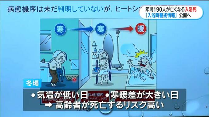 冬に多くなる「浴室内突然死」=いわゆる入浴死を減らそうと、鹿児島大学大学院・法医学分野が来月から「入浴時警戒情報」を公開すると発表しました。入浴死について研究しているのは、鹿児島大学大学院・法医学分…