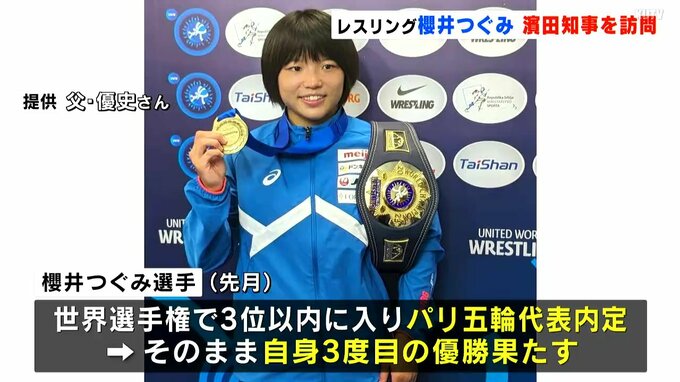 櫻井選手は14日、世界選手権優勝のベルトと金メダル、それに10月に優勝したアジア大会の金メダルを持って、濵田知事にオリンピック代表内定を報告しました。