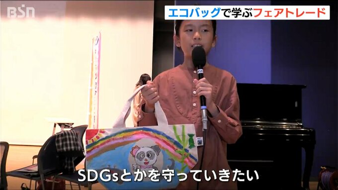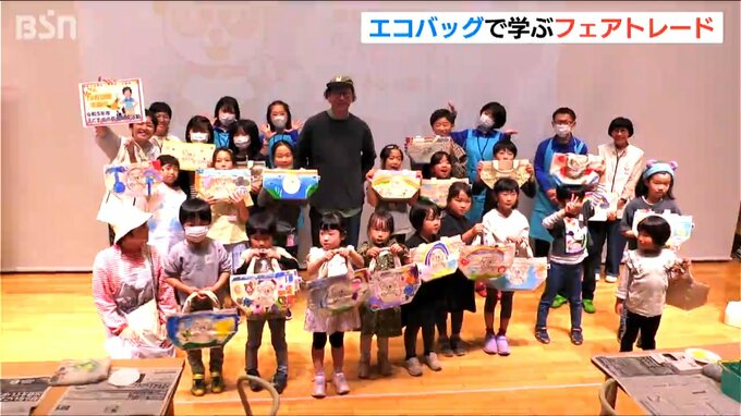 子どもたちはエコバッグを使うことが生産者の労働環境の改善や環境を守ることにつながることを学びました。