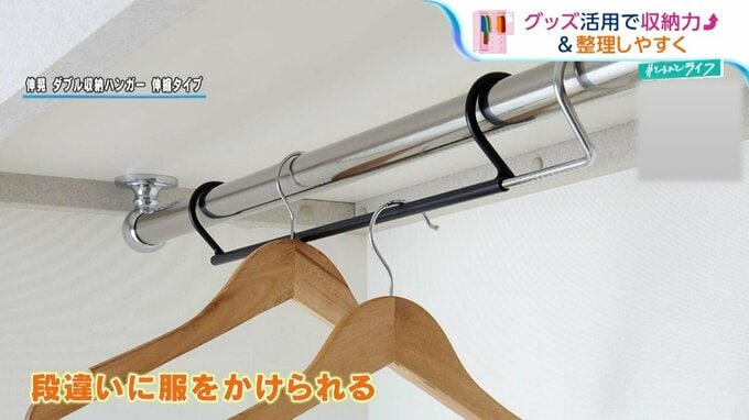 段違いに服をかけることができるので、ハンガー同士が干渉せず、収納スペースが拡大します。