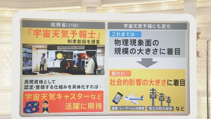 基本的には太陽でどのような活動が行われているのか、太陽フレアを観察する。この宇宙天気予報という部分に関して総務省が、「宇宙天気予報士」という制度を創設することを提言しているんです。民間資格として登録・認定する仕組みを具体化すれば「宇宙天気キャスター」など活躍に期待ができるのではないかということなんですね。