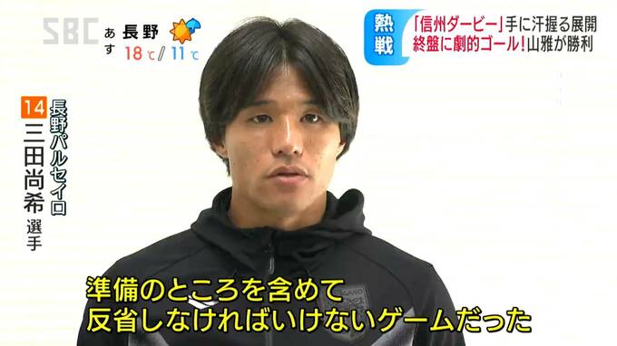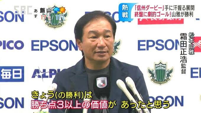 これが決勝点となり、今シーズン3度目のライバル対決は山雅が勝利。