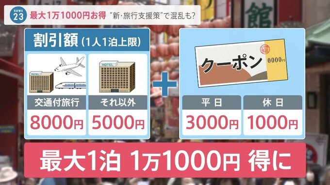 対象は全国で、宿泊旅行での割引上限額は1泊あたり5000円ですが、交通費込みの旅行商品は8000円で、さらに食事や買い物などに使えるクーポンは、平日は3000円、休日は1000円となり、1人1泊、最大で1万1000円お得になります。