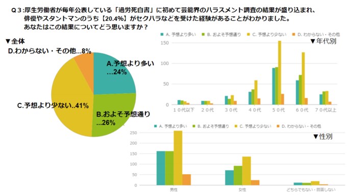 ▽約2割の俳優らが「セクハラを受けた経験がある」と判明した厚労省の調査結果について聞いたところ、 “予想より多い”24%と“予想通り”26%が拮抗しました。