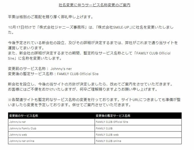 また、【旧・Johnny's net】の公式サイトも【FAMILY CLUB】へと名称を変更しました。