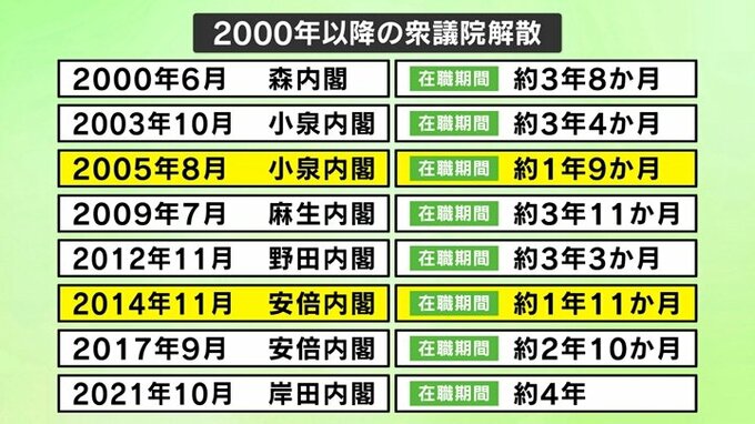 衆議院の任期は4年間ありますが、2000年以降は任期を越えて選挙が行われた前回が異例で、短いものは2年足らずで解散をしています。
