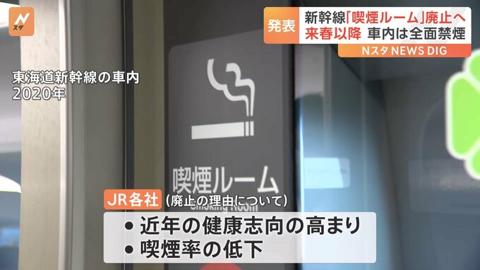 JR東海やJR西日本などは来年の春以降、順次、新幹線の車内にある喫煙ルームを廃止し、車内を全面禁煙にすると発表しました。来年の春以降に順次、喫煙ルームを廃止するのは、JR東海・JR西日本・JR九州のすべての新…