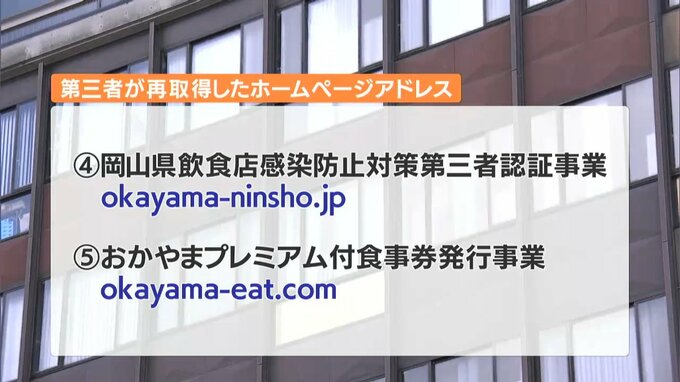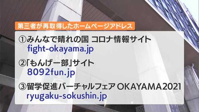 岡山県によりますと、ホームページのアドレスが第三者に再取得されたのは、今年5月まで運用していた新型コロナ対策の関連事業など5件です。