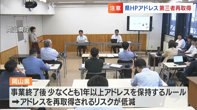 岡山県では事業終了後の少なくとも1年以上、ホームページのアドレスを保持するルールを定めています。これにより、アドレスが再使用されるリスクは低減されますが、