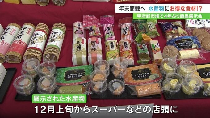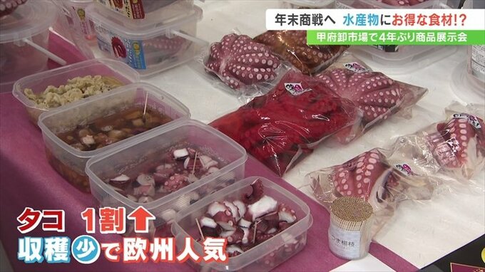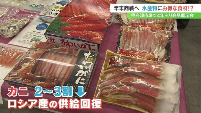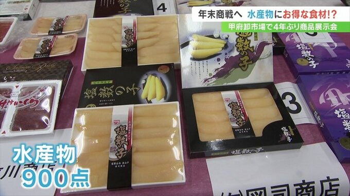 おせち料理などに使う年末年始の水産物の展示会が、甲府市の卸売市場で開かれました。
