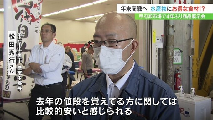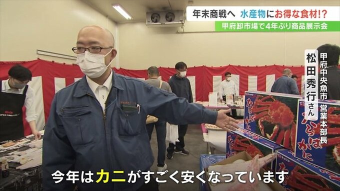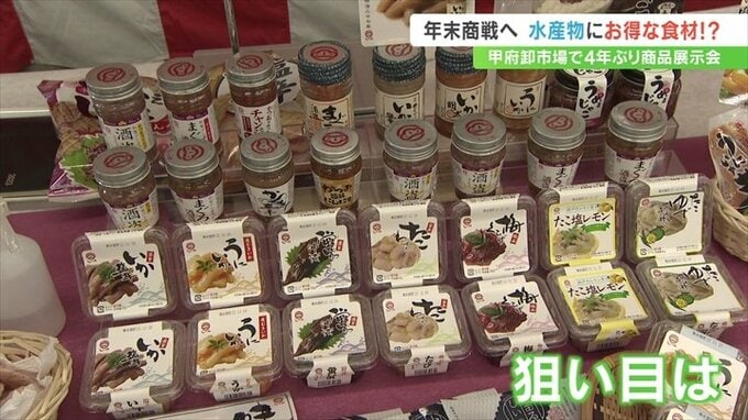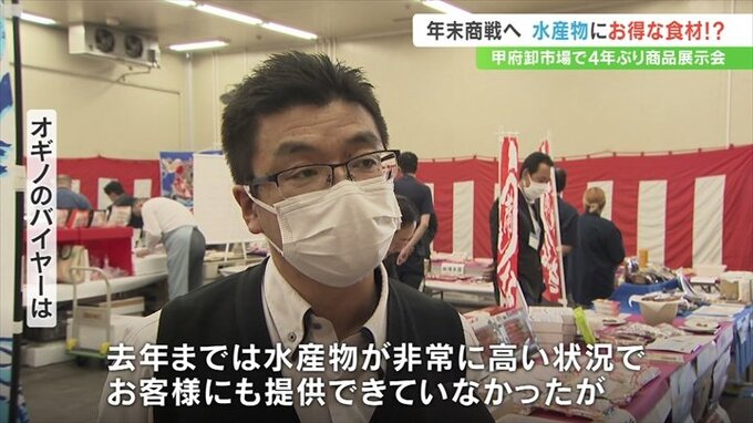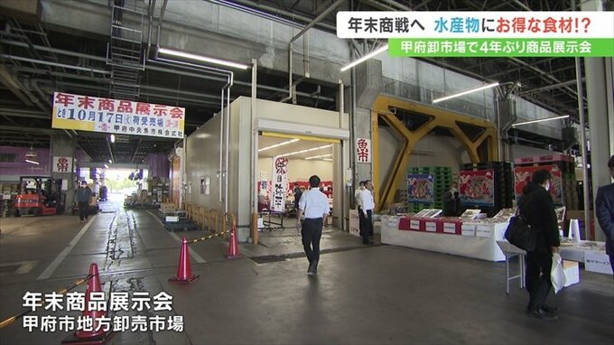 甲府市地方卸売市場で4年ぶりに開かれた年末年始の水産物展示会。