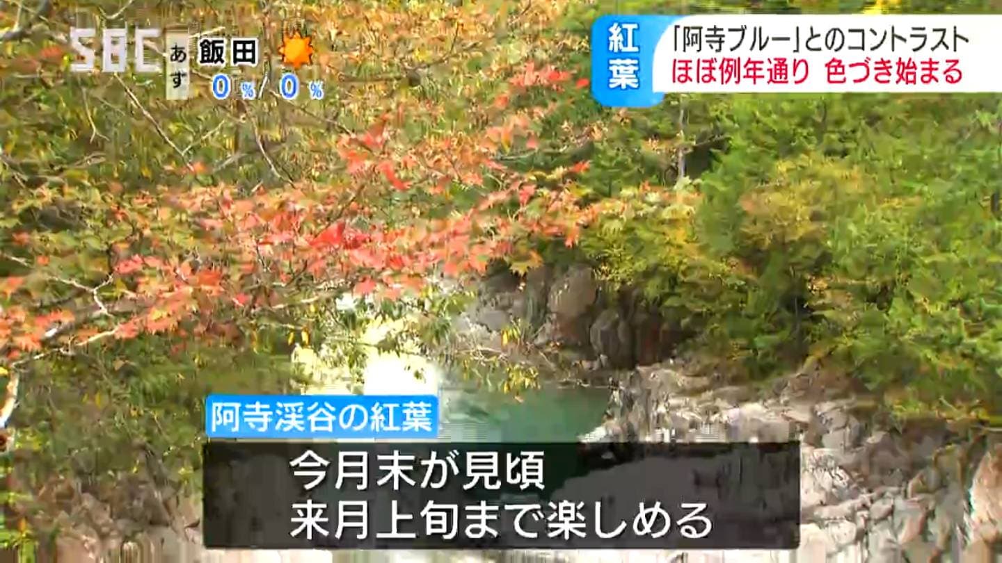 阿寺渓谷の紅葉は10月末に見頃を迎え、11月上旬まで楽しめるということです。