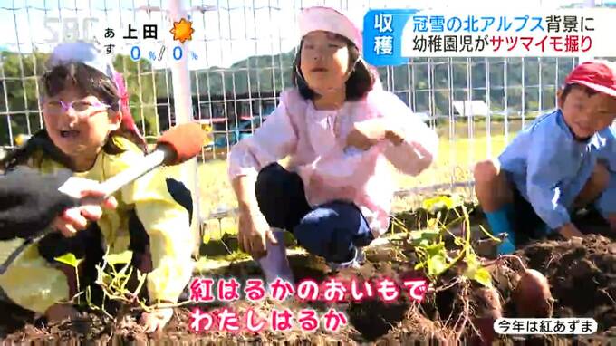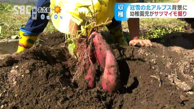 雪をかぶった北アルプスを望む白馬村の白馬幼稚園では、17日、園児63人が園庭に植えたサツマイモを収穫しました。