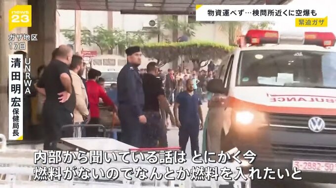 「内部から聞いている話はとにかく今、燃料がないので、何とか燃料を入れたいと。国連機関もガザ北部に倉庫があって、燃料や医薬品が在庫で置いてあったが、危険なので避難した」