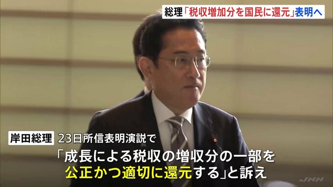 岸田総理があさってから始まる臨時国会の所信表明演説で、減税も念頭に、税収の増加分の一部を国民に還元する考えを訴えることがわかりました。所得税減税も含めた具体策の議論を行うよう、近く与党の税制調査会に…