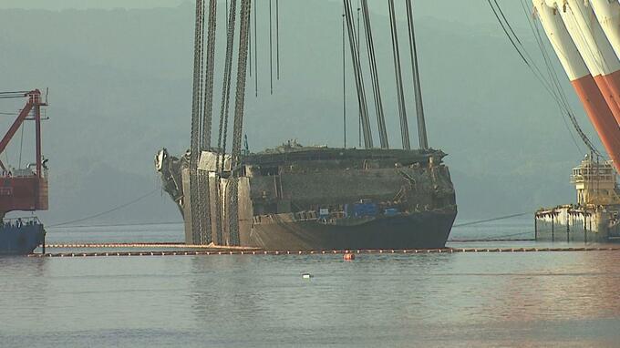 愛媛県今治市沖の来島海峡で、ケミカル船と衝突して沈没した貨物船「白虎」について、えい航するため船を反転させる作業が行われ、甲板などが海上に姿を現わしました。おととし来島海峡に沈没した「白虎」は、…