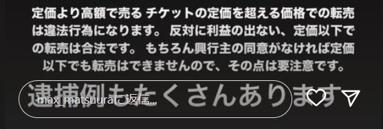 エイベックス株式会社の松浦勝人会長もストーリーズに浜崎さんの投稿を引用して「定価より高額で売る チケットの定価を超える価格での転売は違法行為になります。」と警告しています。「もちろん興行主の同意がなければ定価以下でも転売はできませんので、その点は要注意です。」と念を押し、「逮捕例もたくさんあります」と大書して、高額転売を止めるよう促しています。