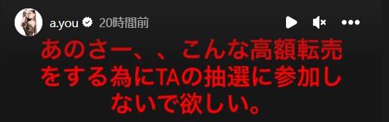 浜崎さんはストーリーズの画面に、黒地に赤い文字で「あのさー、、こんな高額転売をする為にTAの抽選に参加しないで欲しい。」と大書し、その下に高額転売サイトのスクリーンショットを掲載。定価の数倍にもなる数字が明らかにされています。そして、そのスクリーンショットの下に「ダメだって、マジで。」と怒りに満ちた言葉を掲げています。