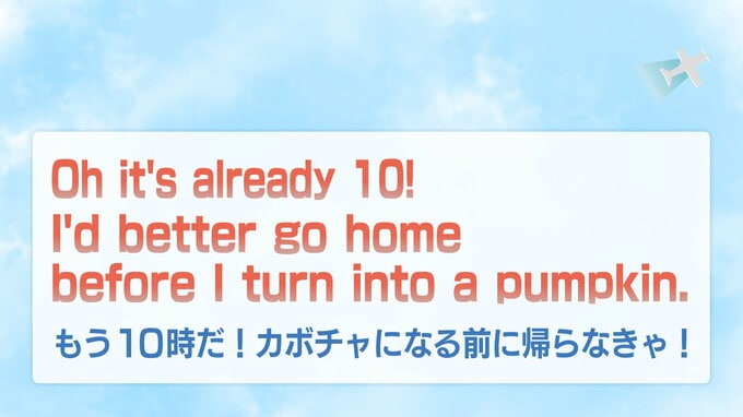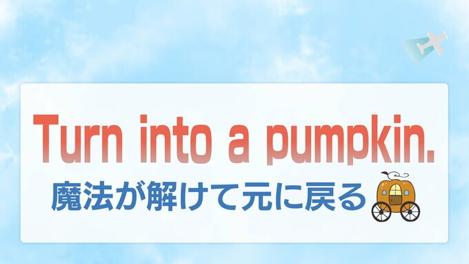 Turn into a pumpkin.には「家に帰る時間」や「寝る時間」の意味がありますので「かぼちゃに戻る」は「遅くなったので帰らなきゃ」といった使い方になります。