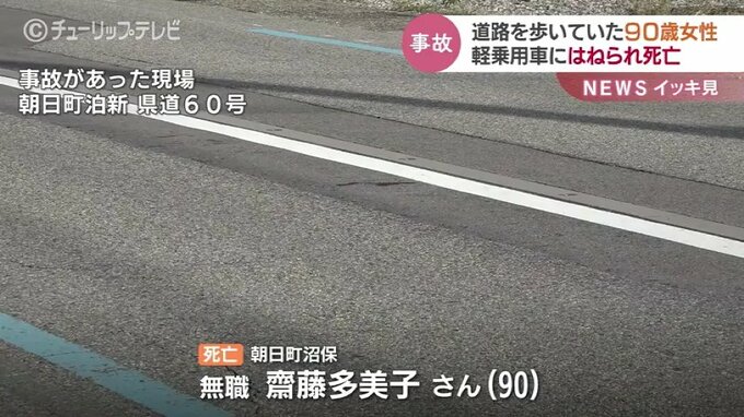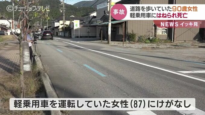 18日午前7時50分ごろ、富山県朝日町のあさひ総合病院前の県道で、道路を歩いて横断していた朝日町沼保の無職・齋藤多美子さん(90)が軽乗用車にはねられ、その後、死亡が確認されました。