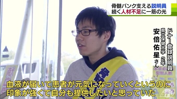 県立保健大学の2年生・安倍佑星さんです。まだ、ぎこちなさはありますが丁寧に説明しています。安倍さんは献血のサポートなどを行う大学のボランティアサークルで活動する中で骨髄ドナーの説明員を目指すようになりました。