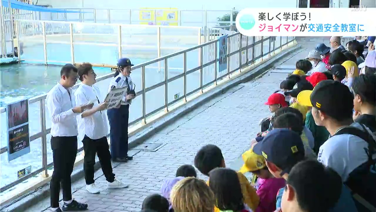 高知市の桂浜水族館で開かれたイベントは、交通安全について子どもたちに楽しく学んでもらおうと県警が主催しました。桂浜公園前では桂浜水族館のマスコットキャラクター=おとどちゃんがチラシなどを配り、交通安全を呼びかけました。イベントにはお笑い芸人のジョイマンも登場!得意のギャグを披露し子どもたちの心をがっちりつかんだ後、交通安全のクイズを出したり、横断歩道を渡り方を教えたりしました。