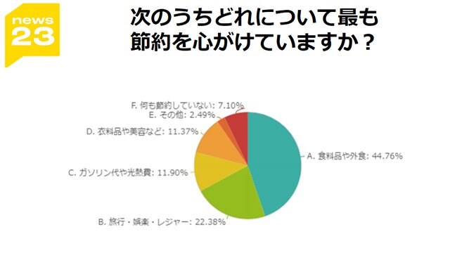 ▽物価高が続く中、どの部分の節約を最も心がけているか聞いたところ、「食料品や外食」、「旅行・娯楽・レジャー」、「ガソリン代や光熱費」の順に多くなりました。