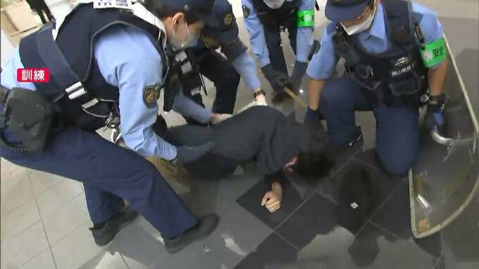 訓練は、標的となりやすい大型商業施設やイベントを警戒して行われたものです。従業員や警察官ら約30人が参加し刃物を持った不審者が現れ警察官が取り押さえたところ爆発物が見つかったとの想定で行われました。
