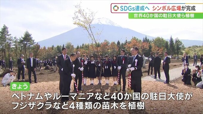 19日は完成を記念し、長崎知事やベトナムやルーマニア、エクアドルなど40か国の駐日大使らがフジザクラやイロハモミジなど4種類146本を植樹しました。