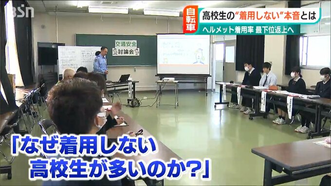 警察が意見を求めたのは阿賀野市にある県立阿賀野高校の生徒たち。通学などで自転車に乗る機会の多い高校生の声を着用率アップに向けた活動に活かそうと、地域の交通安全協会や阿賀野市を交えた討論会が開かれました。