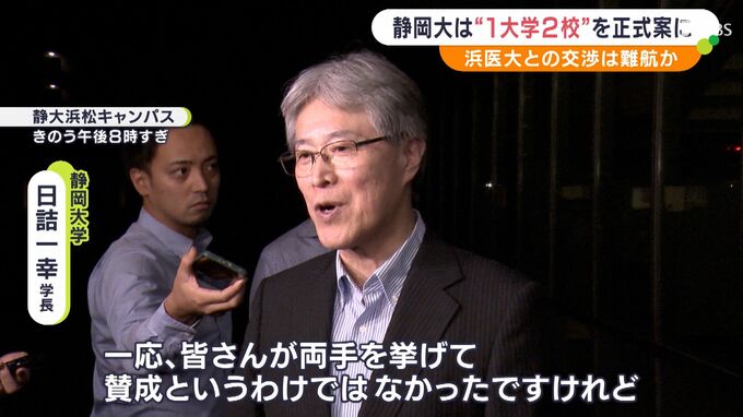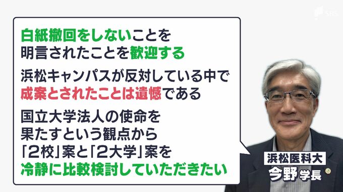 静岡大学の決定を受け、浜松医科大学の今野弘之学長は「白紙撤回をしないことを明言されたことを歓迎する」と述べた一方で「浜松キャンパスが反対している中で、成案とされたことは遺憾である」とくぎを刺しています。